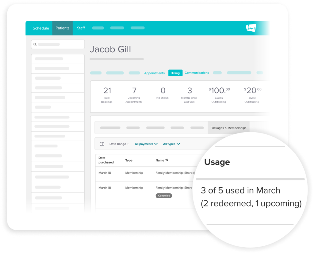 Set up packages and memberships that fit your practice and pricing. With everything in Jane, payments are automated and performance tracking is easy so you can monitor and grow your business your way.